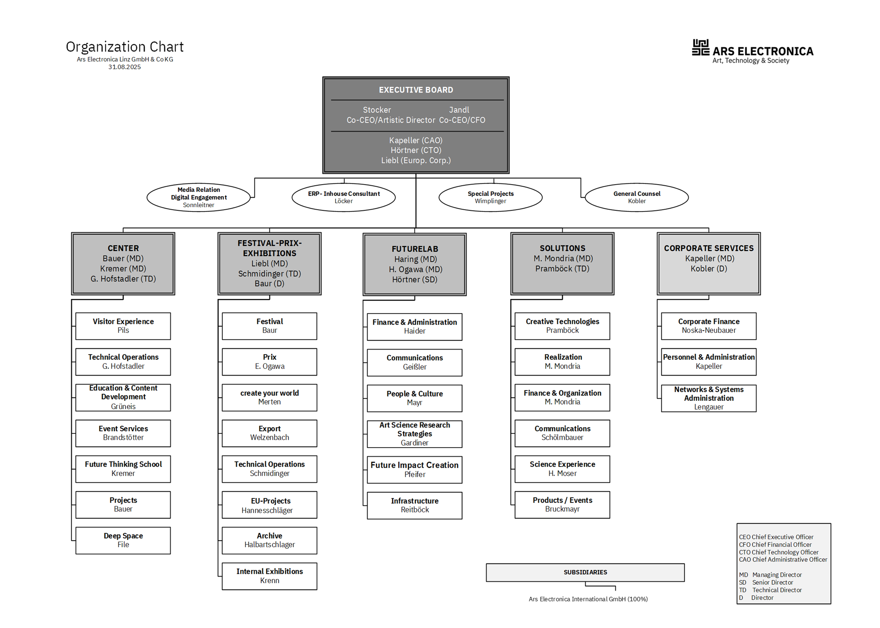 Ars Electronica Linz GmbH & Co KG is a company of the City of Linz and consists of the operational divisions Ars Electronica Festival-Prix-Exhibitions, Ars Electronica Center, Ars Electronica Futurelab, AE Solutions and Corporate Services. We employ more than 200 people from all over the world who contribute their know-how and commitment to the further development of Ars Electronica’s vision on a daily basis.