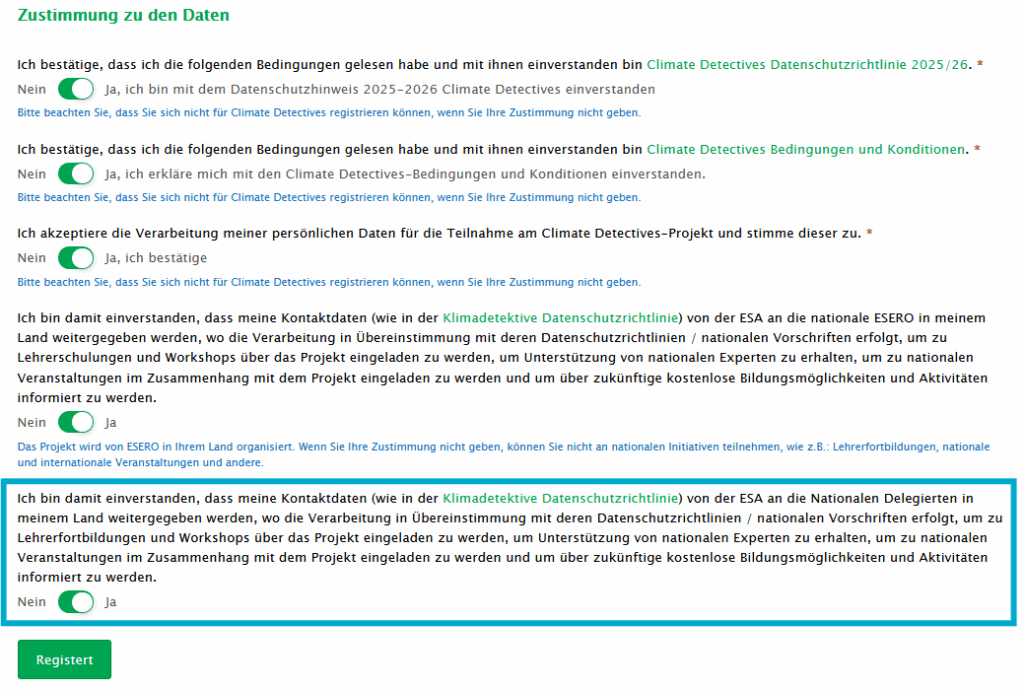 Wichtiger Hinweis zur Anmeldung: bitte stimmen Sie bei folgendem Punkt zu, damit wir Ihre Kontaktdaten bekommen, und Sie zu den Expert*innen-Talks, Feedbackrunden, Climate Detectives Summit, usw. einladen können!