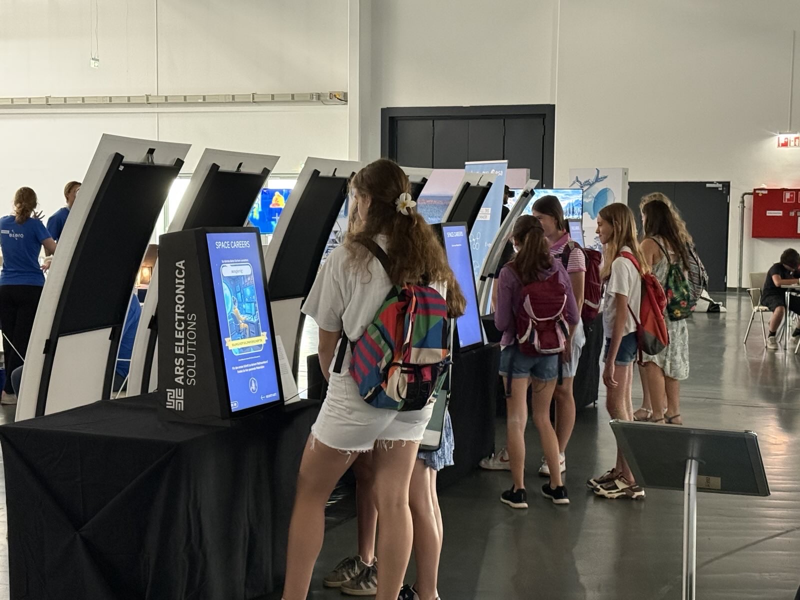 From June 23 to 25, Hall X4 at the Austria Center Vienna was transformed into a learning and experience space for up to 2,500 students aged nine and older. Under the title School Activities, ESERO Austria and Ars Electronica Solutions jointly offered workshops on Earth observation, organized guided tours through the exhibition areas, and hosted stage shows with space experts.